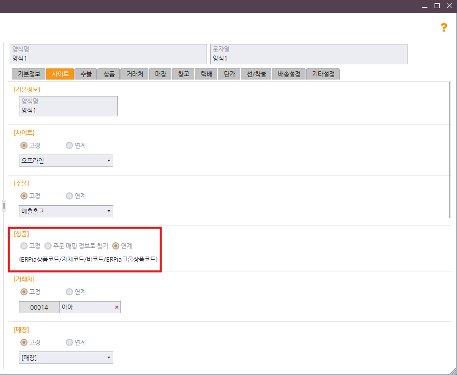 매출엑셀일괄등록 > 양식옵션세팅의 상품을 연계로 설정한 경우