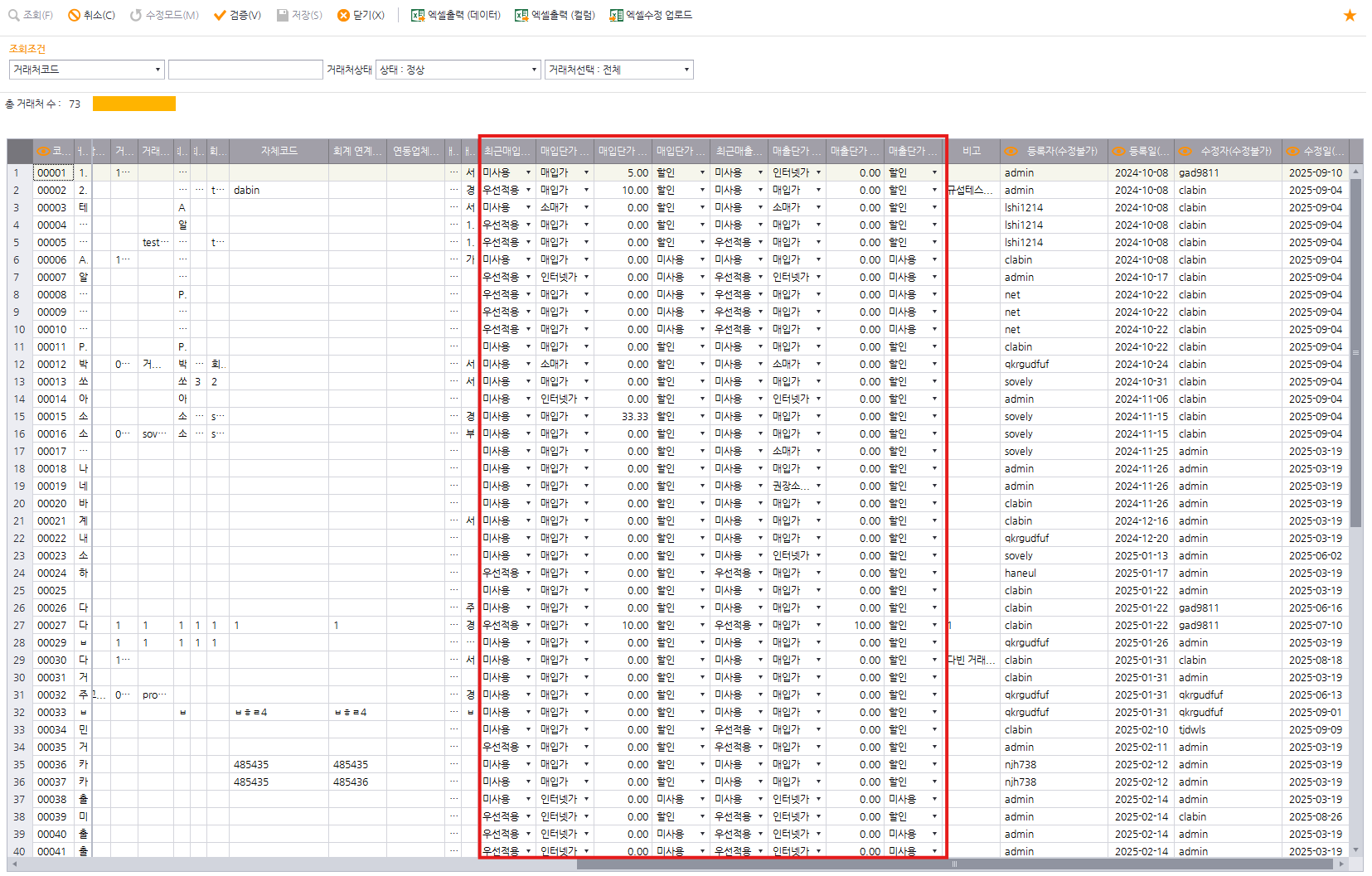 거래처정보 일괄관리에서 수정시 정해져있는 값의 경우 콤보박스로 선택하여 수정하게 변경