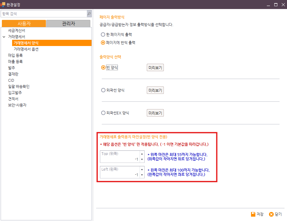 거래명세표 빈양식에 위쪽, 왼쪽 여백 설정 기능 추가