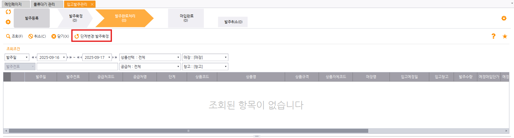 입고발주관리 발주처리완료 -> 발주확정 단계이전 버튼 추가